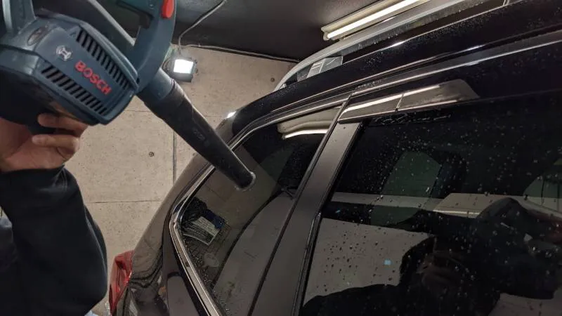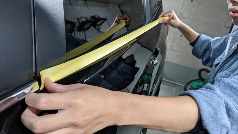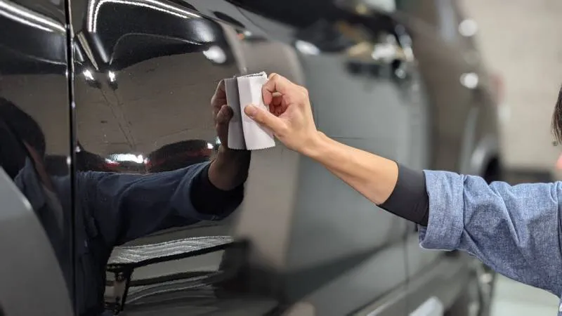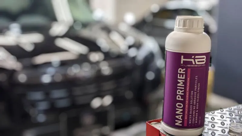 ナノプライマーを塗布。温度・湿度、車のメーカーによって異なる塗装ごとにプライマー塗布後の待機時間を置きます。
