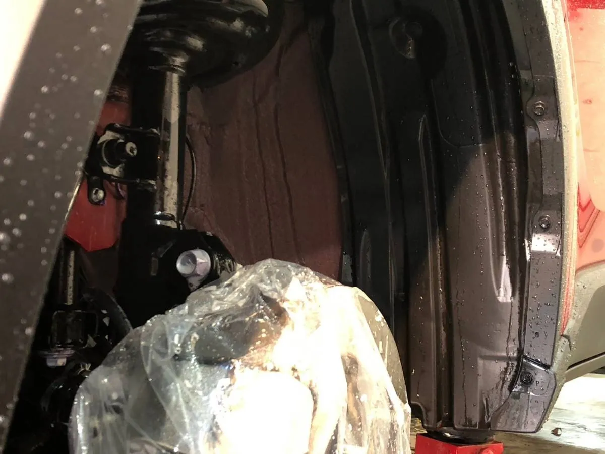 タイヤハウス内のプラ部分は、樹脂パーツ専用のコーティング剤を無料で施工させていただいております。