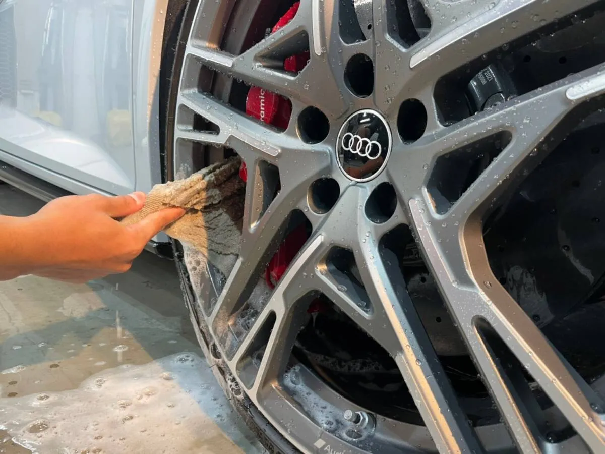 ホイールを洗浄。足元から隅々まで洗浄を行う事で、後のプロテクションフィルム施工時のゴミ噛み要因を少しでも減らします。