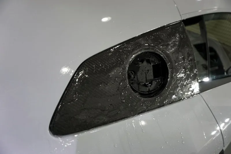 リアウインドーと一体化したアウディR8のアイコニックなカーボンパネル。フューエルリッドを外しここにもPPFをインストール。