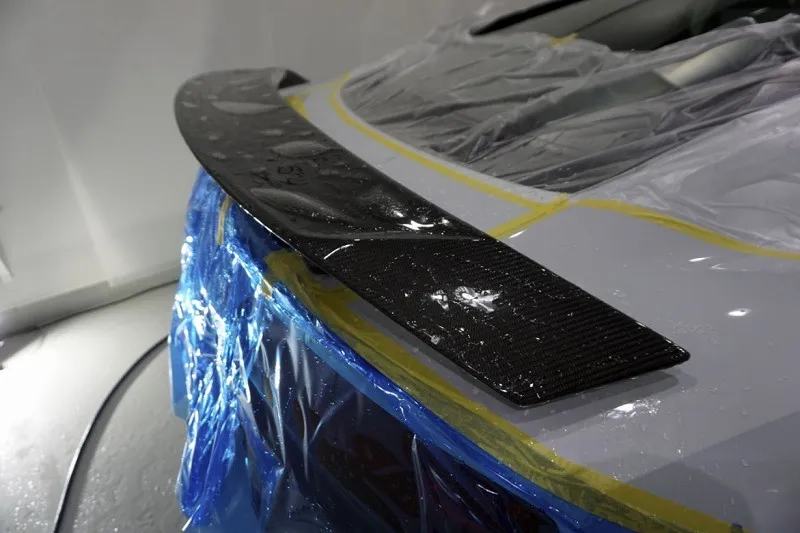 洗練されたシェイプのグロスカーボンウイングにもプロテクションフィルムを施工。カーボンウイングで散見されるクリア剥がれなども抑制することができます。