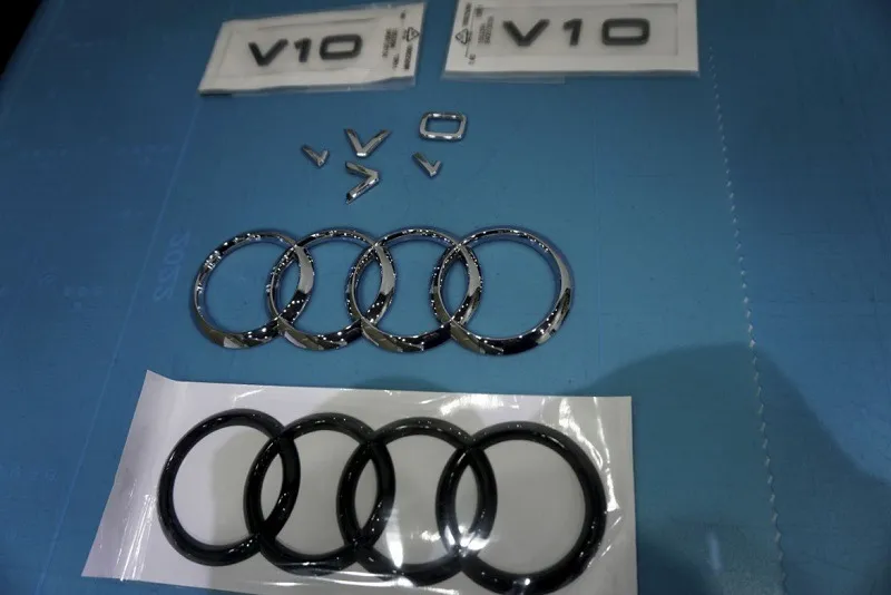 事前にお客様にご用意いただいたグロスブラックのアウディエンブレムとV10オーナメント。