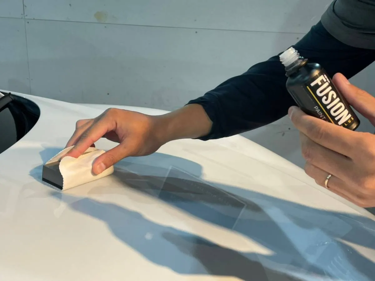 プロテクションフィルム用セラミックコーティング “XPEL FUSION(フュージョン)” を施工。紫外線カット効果が高く、主にフィルムの糊面の劣化を抑制することができます。本国アメリカではこの “FUSION” を施工しなければプロテクションフィルムの保証をしないケースもあるほど重要視されているPPF保護剤です。